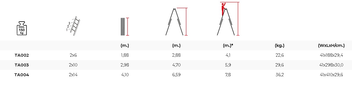 Dve osobe mogu istovremeno da rade zajedno na merdevinama. Kuka sa jedne strane se može pričvrstiti za stepenicu dok je druga kuka pričvršćena za drugu stepenicu i to omogućava da se ove merdevine koriste na stepenastim podovima. Širenje je fiksirano jakim trakama, a rizik od klizanja je eliminisan gumenim poklopcima za stopala. Klizni sistem i stepenasti sistem zaključavanja su izuzetno izdržljivi i sigurni. Ove merdevine su praktične i lagane zbog aluminijumske konstrukcije i mogu se koristiti u raznim oblastima.