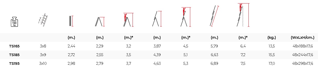 Ove merdevine možete koristiti kao prislonjene merdevine, klizne izduzene merdevine, dvostrane stojeće merdevine, klizne ukošene merdevine ili ih možete koristiti sa svojom funkcijom stepenica. Stabilizatore možete lako instalirati uz pomoć montažnog ključa u pakovanju. Sigurnosna traka je aktivna kada su merdevine u položaju A i pričvršćene su kroz stepenice. Sigurnosni stepenik crvene boje ukazuje na maksimalnu radnu visinu.