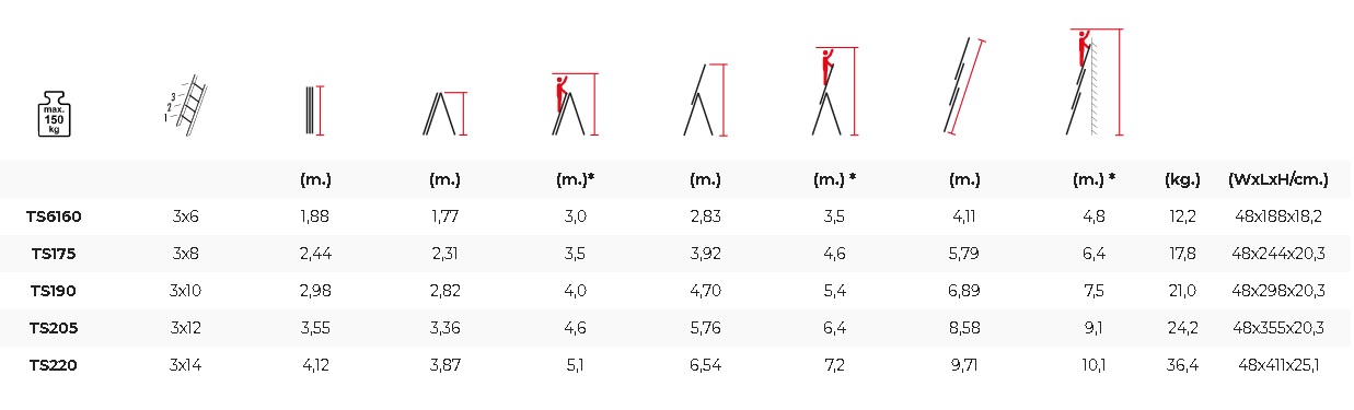 - Dimenzije grede: 63x25 mm. (TS6160), 75x25 mm. (TS175, TS190, TS205), 100x25 mm. (TS220)